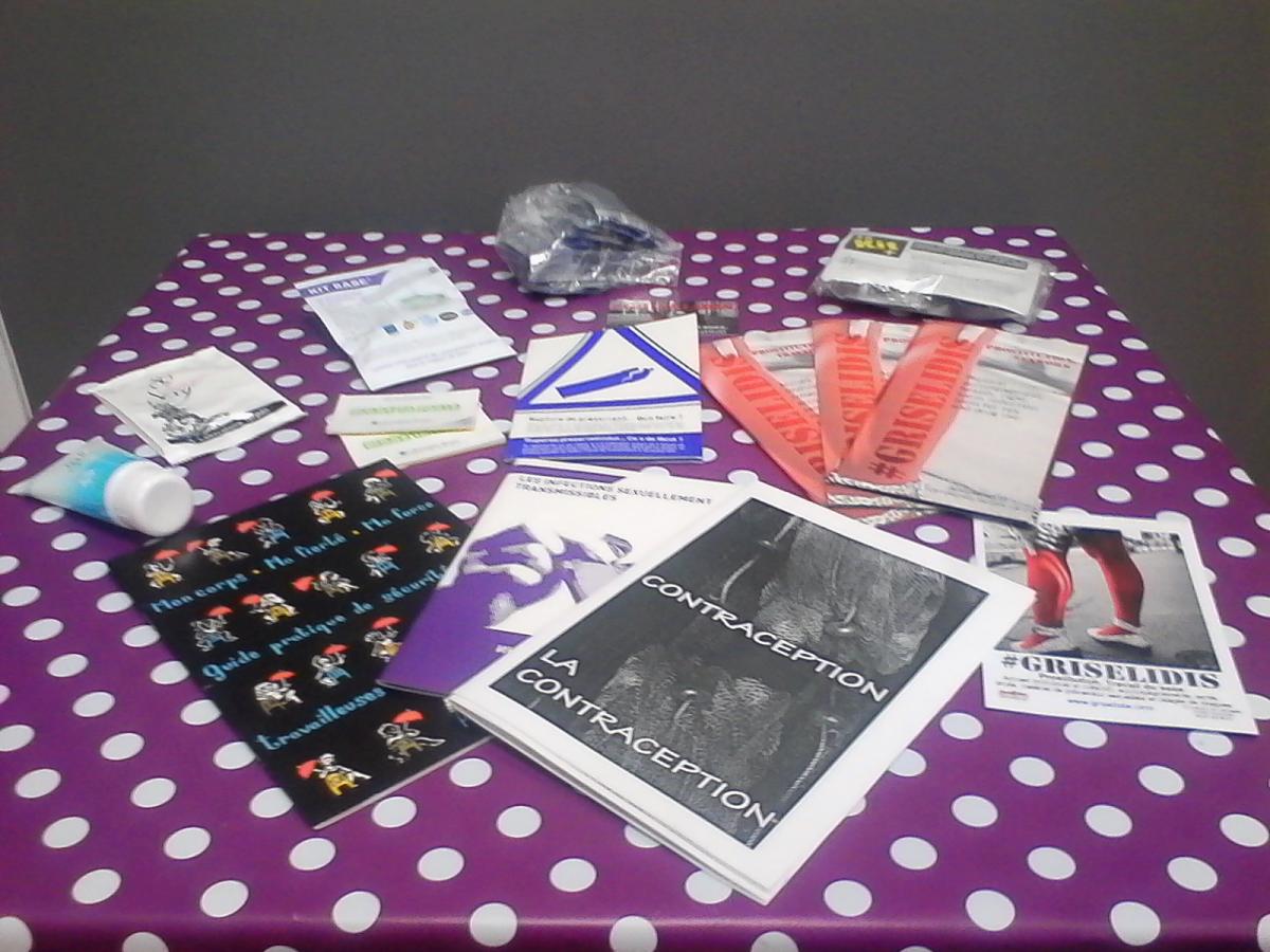 «Femmes et VIH», guide des hépatites, dépliants de prévention sur l’usage de drogues (alcool, cocaïne, GHB), plusieurs dépliants de présentation de l’association, des magazines d’actualité sur la lutte contre le VIH, - Des outils de prévention: préservatifs externes (masculins), préservatifs interne (féminins) accompagné de leurs modes d’emploi, un autotest VIH, du gel (à base d’eau et des échantillons à base de silicone), des «Roule ta paille», "Kit Base" (Pipe à crack), "Kit plus" (kit injection).